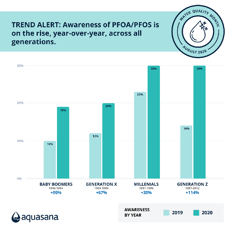 - Awareness around PFOA/PFOS is on the rise: We found a 44% year-over-year increase in people who said they are familiar with PFOA/PFOS as it relates to tap (or drinking) water (18% vs. 26%).
