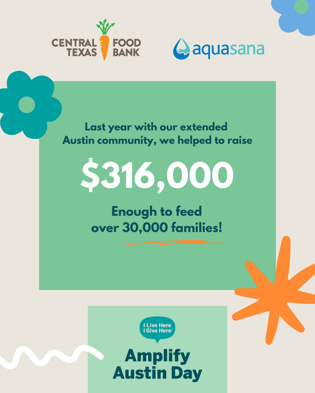 As part of Amplify Austin Day on March 6, Aquasana is donating $5,000 to match individual contributions made that day. This 24-hour giving event supports over 700 nonprofits across Central Texas, and we’re honored to play a role in making an impact. The Food Bank provides more than 54 million meals a year to those in need, and our donation will help them continue their critical work.