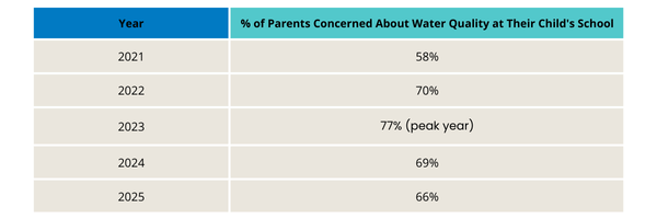 From 2021-2023, concern was increasing each year — but it’s gradually declined since. This could possibly be due to growing public awareness of federal action and assumptions that the issue will be addressed, like the EPA’s revisions to the Lead and Copper Rule had a compliance deadline of Oct 2024. Still, more than half of parents remain concerned, signaling further action is needed.