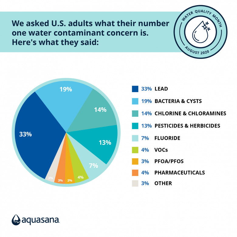 - 1 in 3 U.S. adults (33%) chose lead as their top water contaminant concern: Followed by Bacteria & Cysts at 19% and Chlorine & Chloramines at 14% to round out the top three water contaminant concerns.