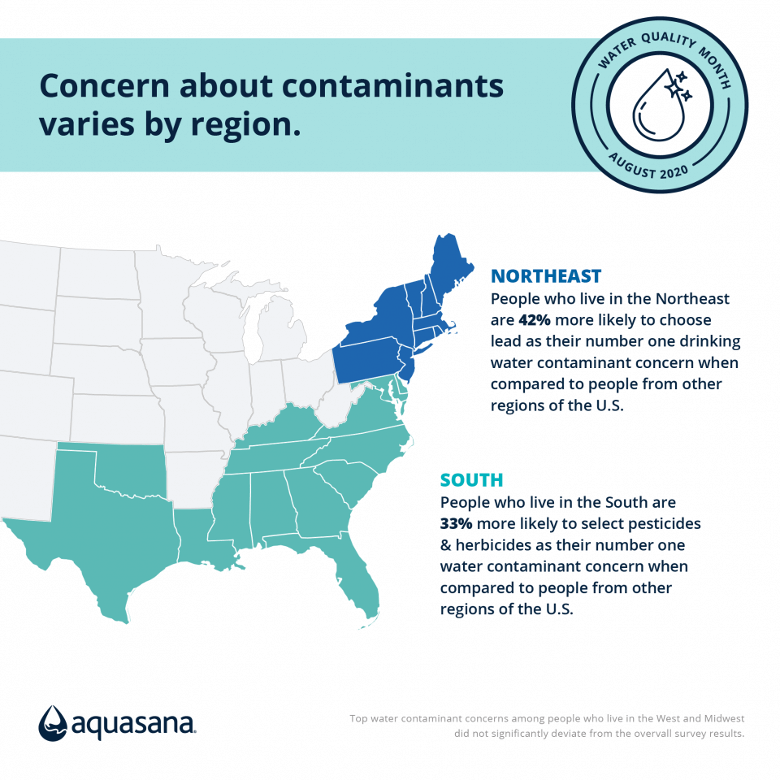 We found people who live in the Northeast are 42% more likely to choose lead as their top drinking water contaminant concern than those who live in other parts of the country. People in the Northeast are also 114% less likely to select pesticides and herbicides as their top concern when compared to non-Northeasterners (7% vs. 15%).