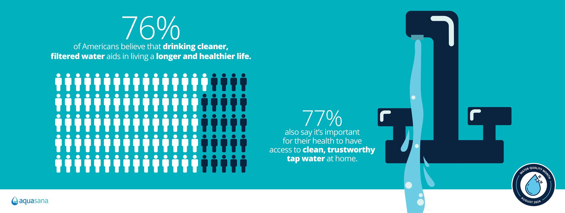 2024 marks the 6th installment of the annual Aquasana Water Quality Survey, and the most notable finding from this year’s data reveals how closely Americans associate filtering their drinking water with overall longevity. In fact, 76% of Americans believe drinking clean, filtered water aids in living a longer and healthier life. Additionally, more than three-quarters (77%) of U.S. adults agree that access to clean, trustworthy tap water at home is important for their health.