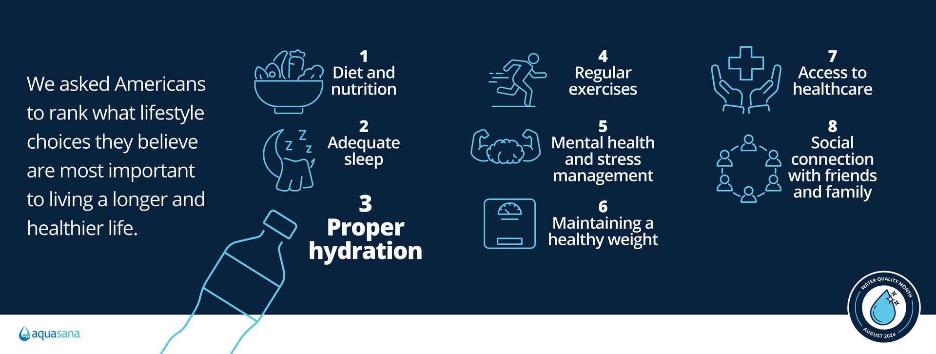 Our survey revealed Americans believe hydration is vital for their health, and these National Institutes of Health findings support that belief. In our survey, we asked people to identify the top three lifestyle choices they think are most important to living a longer and healthier life. Hydration took the number three spot for most important lifestyle choice, following diet and nutrition, and adequate sleep.