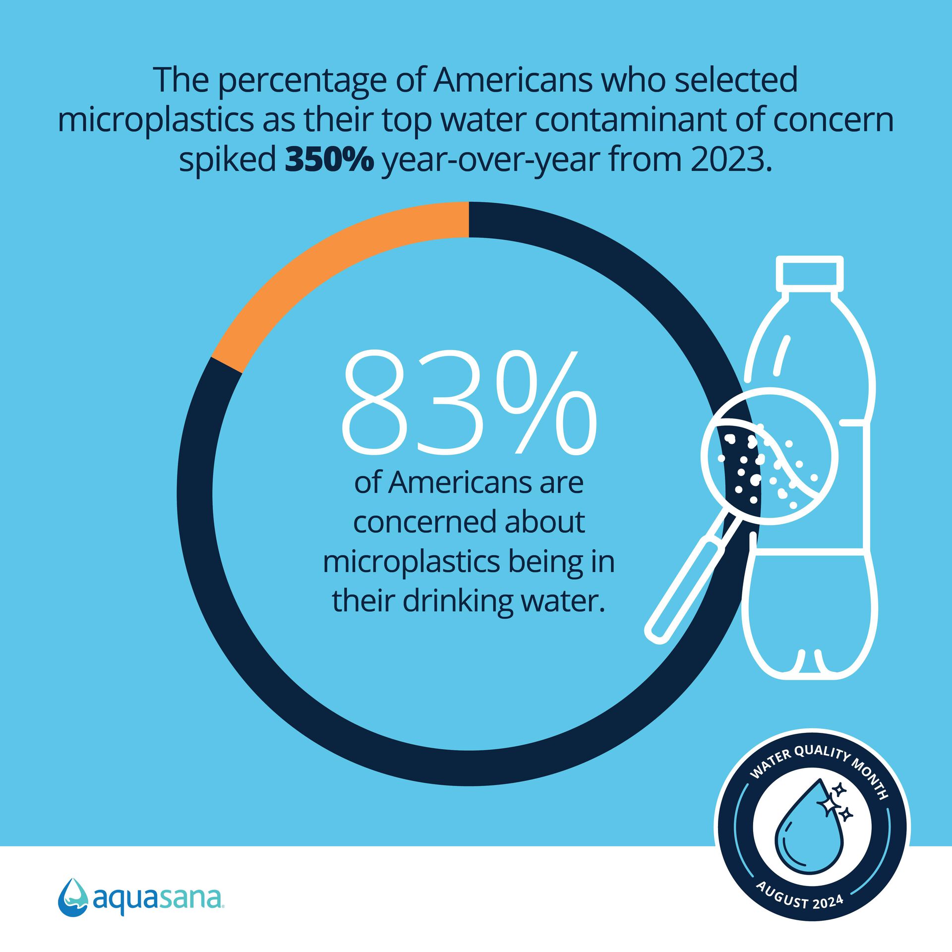 This year’s survey data revealed a significant increase in the percentage of Americans who selected microplastics as their top contaminant concern (9%), up 350% YoY from 2% in 2023. In line, the survey also found that 83% of U.S. adults are concerned about microplastics being in their drinking water.