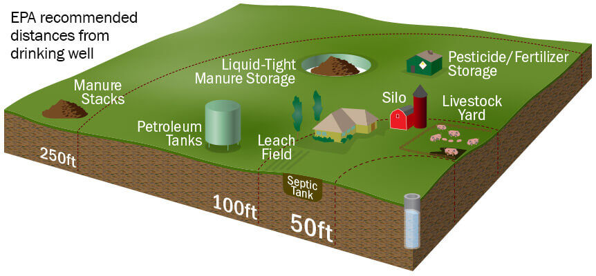 - 50 feet away from septic tanks, livestock yards, silos septic, and leach fields