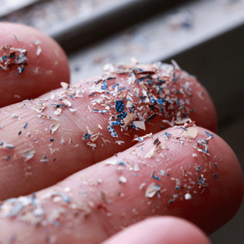 Microplastics are small plastic particles, less than 5 millimeters in size (about the size of a chia seed), that are a byproduct of plastic waste. These particles come from a range of sources, including microbeads in personal care products, such as exfoliating scrubs, synthetic fibers from clothing, toys, electronics, and more.