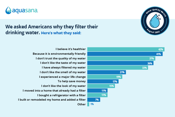 We know that water filtration is becoming more popular over time, but what reasons are driving these changes? To understand this trend, we asked people who currently filter their water about their reason for doing so. Take a look at the results below, and read more detailed findings on the top three answers in the following sections.