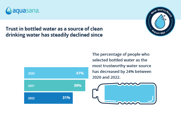 This accounts for the combined results of several types of filters (whole house, under sink, etc.), although the highest standalone answer was bottled water with 31% of the vote. But as should be expected, trust in bottled water has gone down over time, from 41% of people rating it as the most trustworthy source in 2020 to 39% in 2021 and a staggering drop to 31% this year.